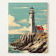 A lighthouse and keeper's cottage sit on a rocky headland, overlooking a calm sea on a blue-sky day, rendered in a vintage travel poster style.