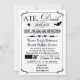 This vintage poster style "Ate, Drank and Got Married" post-wedding Halloween reception typography black and white chalkboard LOOK wedding invitation has a variety of scary looking fonts and scrolls on it, along with a pair of purple hearts, a spider on a spider web, a black bat, and pointing hands. It has a funny new take on the "Eat, Drink and Be Married" trend that is perfect for the young hipster couple, the gothic couple, or the chic couple wanting a truly original Halloween wedding invitation that will be remembered by all their guests. It is shown here on basic paper. It is easily customised with your own information. There is some customisable text that you can edit the way you require. ALSO, please note that everything will print as it appears on your monitor. Zazzle will not edit anything for typos or alignment etc., and I will not see it once you have ordered it. If you need help with your wording, please email me BEFORE you order. If there are any other items you need to make your event extra special, please email your request to niteowlstudio@gmail.com.