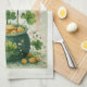 A kitchen towel with a seasonal St. Patrick's Day image. Faded grunge style paper. A green pot of gold with coins