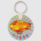 Cute cartoon style blimp balloon flying in sunny blue sky. Original design. Custom keychains. Decor and gift idea for adults and kids.