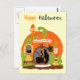 A cute, vintage illustration of a little pumpkin house, with a witch, standing in the the doorway, brewing a potion or a soup maybe. There is an adorable, black cat, sleeping, on the window sill. The pumpkin house has a chimney, a big cage attached to it, and the house is covered in vines. Great for those who love witches, pumpkins, and Halloween vintage art.