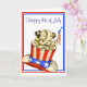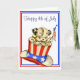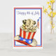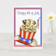 A vintage image of a puppy carrying a flag and is in a Red, White and Blue tophat.