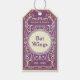 A purple and cream label for bat wings. The design features a vintage Victorian or art deco style pattern in cream on a dark purple background with a circle in the center for the title of the ingredient. The idea is that you use this tag to decorate a prop for Halloween or to label cocktails or drinks for a party.