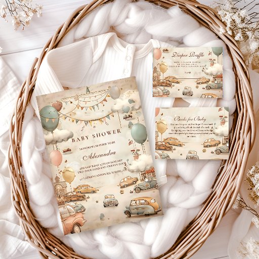 A fun and nostalgic baby shower invitation featuring a retro race car theme in red, blue, and gold tones. The design showcases vintage toy cars, balloons, stars, and confetti on a textured parchment background — perfect for celebrating a baby boy with a playful, old-fashioned twist. Ideal for car lovers and parents who appreciate timeless, whimsical designs.