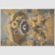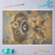The image portrays a charming racoon lady, elegantly attired in a yellow gown that radiates like the petals of a marigold. Her dress is adorned with ruffles and lace, and she holds a parasol that blooms with roses, matching the floral backdrop that surrounds her. Dame Marigold of Raccoonshire is a figure of grace and poise, her attire a perfect blend of nature’s beauty and the sophistication of high society. This digital artwork by RHDesigns, suitable for decoupage on furniture or as a canvas piece, brings a whimsical touch to any home decor