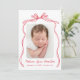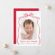 Celebrate your little one's arrival with our elegant Vintage Red Bow birth announcement. Showcase your newborn's photo framed by a charming red bow, with your baby’s name in a lovely handwritten red script. Below, you can add birth details like weight, length, and date. The back offers space for an extra photo and a personalised message to loved ones. This customisable keepsake is the perfect way to announce your newest family member with style and grace!