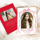 Announce your graduate’s milestone with this elegant and timeless graduation announcement, featuring a photo displayed in an arch-shaped frame, accented by a hand-drawn red bow and ribbon on a classic white background. The graduate’s name is highlighted in a stylish handwritten red script, with their school and graduation year elegantly displayed below. The back of the announcement includes a horizontal photo and space for a custom message, perfect for sharing gratitude, future plans, or party details. This sophisticated design offers a modern yet vintage-inspired way to celebrate your high school or college graduate’s achievement!
