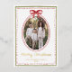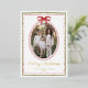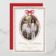 Send elegant holiday greetings with this timeless Christmas card featuring your family photo framed in a watercolor oval design accented by a red bow and dotted border. “Merry Christmas” appears in shimmering gold foil script, with your family name and year displayed below in matching gold foil lettering. The white background framed in red and green adds classic holiday charm. The back includes a single square photo with space for your personalised message, creating a warm and sophisticated way to share your Christmas wishes.