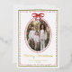Share joyful holiday greetings with this elegant Christmas card featuring your family photo framed in a watercolor oval design accented by a red bow and dotted border. “Merry Christmas” is displayed in gold foil script, with your family name and year printed below in coordinating gold foil lettering. The white background bordered in red and green enhances the vintage-inspired charm. The back features a 4-photo collage with room for your personalised message, creating a festive and timeless way to share memories and warm wishes.