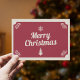 A vintage Christmas greeting card in red and beige tones, surrounded at the 4 corners by notches and lines reminiscent of the sun, a snowflake and a pine tree. At the back, you have a customisable message in faded red and another pine tree.