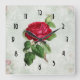 An illustration of an open blossoming red rose with the stem visible and surrounded by green foliage. The background has a vintage feel with a mottled gray parchment background.