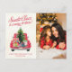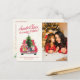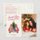 A cute holiday photo postcard featuring the words "Santa Claus is coming to town" in a festive typeface with a watercolor truck filled with gifts, Christmas tree and Santa hat. The back has placeholder text for your own holiday letter. © 2020-Present | The Spotted Olive | All Rights Reserved.