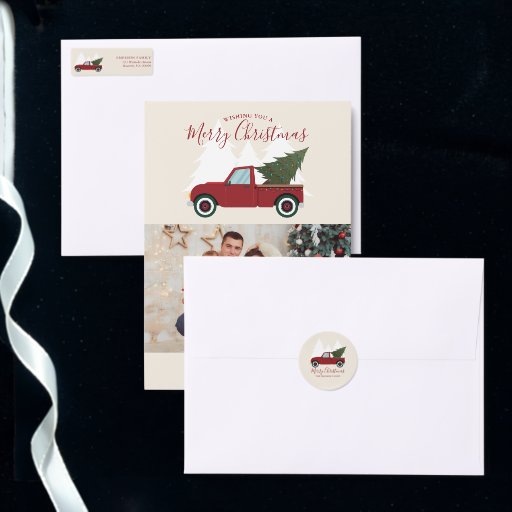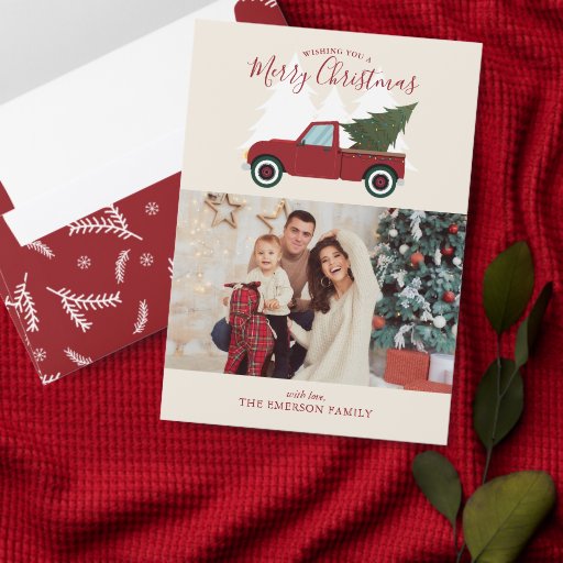 Whimsical illustration of an old fashion red truck carrying a Christmas tree.