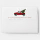 Whimsical illustration of an old fashion red truck carrying a Christmas tree.
