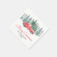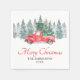 Vintage christmas paper napkins featuring a simple white background, watercolor spruce trees, a red truck, a xmas tree, the words "merry christmas", your name, and the year.