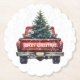 An old fashioned themed Christmas featuring a vintage red truck with a Christmas tree with snow and falling snowflakes. The Merry Christmas is editable.