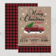 Personalize all the details on these fun, rustic country Christmas party invitations for your upcoming celebration. This design features a classic red and black buffalo check background with a faux kraft paper layer, a vintage watercolor red pick up truck with a Christmas tree, and snowflakes.