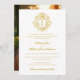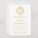 Create a timeless impression with this elegant wedding invitation featuring a classic crest design adorned with intricate floral details. The sophisticated monogram at the top adds a personal touch, while the refined serif and script fonts provide a luxurious, traditional aesthetic. The gold and white colour palette enhances the overall charm, evoking a sense of grace and sophistication. The back showcases a photo, perfect for adding a personal moment or serene visual to complement the front design. Ideal for couples seeking a formal and refined invitation for their wedding celebration, this design exudes timeless elegance and understated beauty.