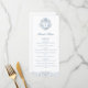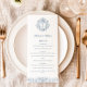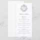 Add an elegant touch to your wedding reception with this sophisticated menu card featuring a classic crest design with intricate floral details and a customisable monogram. The timeless combination of soft blue accents and refined serif and script fonts creates a polished and formal aesthetic that complements a traditional or upscale wedding theme. The clean layout ensures your menu selections are presented clearly, while the vintage-inspired crest adds a romantic and personalised detail. Perfect for elevating your table settings, this design exudes timeless charm and elegance, setting the stage for an unforgettable dining experience.
