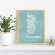 Adorn the walls of your beach house or coastal abode with this vintage style frameable print featuring your family name and year established in retro typography, topped by a pineapple illustration. A distressed effect on a coastal dusty teal aqua background gives this piece rustic appeal.