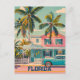A nostalgic and vintage-inspired illustration of a charming pastel-coloured house nestled amidst tall palm trees in Key West, Florida. The house features a spacious porch with white railings and a welcoming front door. The sky is a clear and sunny blue, with fluffy white clouds. The overall atmosphere is peaceful and relaxing, evoking a sense of retro charm .