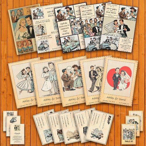 Celebrate your special day with charm and nostalgia! This Vintage Retro Comic Wedding Invitation features delightful 1940s-inspired comic illustrations. Perfect for couples seeking a unique, stylish, and playful touch for their wedding celebration. Fully customisable and available in both print and digital formats.