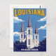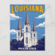 Capture the historic charm of the Pelican State with this striking, vintage-style travel postcard. The design features an illustration of a beautiful, iconic cathedral, likely the St. Louis Cathedral in New Orleans, set against a bright blue sky with wispy clouds. The bold, retro lettering declares "LOUISIANA" and the state nickname. Perfect for travel enthusiasts, architecture lovers, or sending a unique greeting from your New Orleans trip. This design has the look and feel of a classic mid-century travel poster.