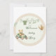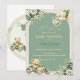 Invite loved ones to a timeless celebration with this vintage-style baby shower invitation, featuring a classic teddy bear driving a retro car, delicate cream florals, and a flying stork carrying a precious bundle. With its muted sage green background and elegant gold accents, this design offers a perfect blend of charm, nostalgia, and warmth.