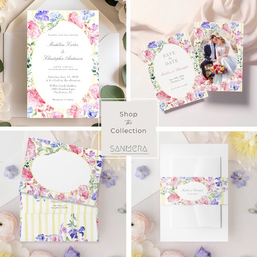 This watercolor floral Regency style wedding envelope is a beautiful way to send your invitation. The design features colourful watercolor flowers and a stylish striped background, suggesting a touch of Regency-era elegance, perfect for a spring or summer floral wedding. You can customise this envelope for a polished wedding look.