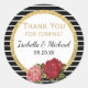 Two vintage roses - one pink and one red - decorate a gold glitter frame on this sophisticated thank you wedding sticker. Black and white stripes add to the elegance. The stripes are very chic because the black stripes are wider than the white. Thank you for coming is written in golden yellow the bride and groom names and their wedding date are written in black. Perfect wedding stickers for a variety of weddings. Easy to customise. They will look fabulous on your wedding favours, wedding cake boxes and thank you notes.