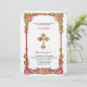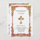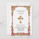 This elegant Christian wedding invitation with a mediaeval flare uses Catholic wording (nuptial mass, sacrament) and features an ornate gold cross and a vintage frame of twining vines and red roses. Background is white, but you can customise and choose any background colour.