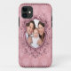 vintage rose personalised photo iphone 5 case. This beautiful iphone 5 cover case is ready to be customised with your own personal photo. This dusky pink vintage pattern with shield shape cut out is easy to adapt to fit your own photograph of a family loved one or pet etc. Soft rose pink background gives a feminine touch to your smartphone cover case and complements your photos to give an elegant retro feel.