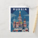Capture the vibrant and whimsical spirit of Eastern Europe with this striking Russia Travel Card. This vintage-style illustration features a majestic cathedral complex, celebrated for its unique onion-shaped domes decorated with bold zig-zags, stripes, and brilliant shades of blue, red, and gold.