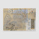 Vintage distressed french themed tissue paper features decorative motifs & ornate floral patterns with tan and blue colour palette on a textured burlap background with vintage typography.