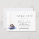 Elegant watercolor vintage sailboat, Save the Date Card. Elegant and modern typography design. Backing colour, shown in navy blue, can be customised.