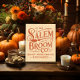 An old fashioned sign for the Salem Broom Co, advertising quality hand crafted and enchanted brooms against a classic, soft orange and cream striped background