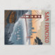 This postcard showcases a vintage-style illustration of San Francisco, California. It features the iconic Golden Gate Bridge, sailboats on the water, a cityscape silhouette, and a cable car in the foreground. The warm tones of the sky suggest either a sunrise or sunset, and "SAN FRANCISCO" is written vertically on the right side.