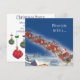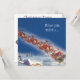 Vintage illustration Merry Christmas holiday image featuring a jolly Santa Claus with his reindeer. They are flying his sleigh full of toys through the blue sky and over a sleeping town covered with snow in winter on Christmas Eve. Ho, ho, ho Happy Holidays and Season's Greetings!