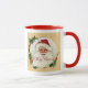 White and red 11 oz. combo mug with a vintage image, on both sides, of jolly old St. Nick on gradated green snowfall in an ecru frame adorned with holly and the sentiment “A Merry Christmas” in red script. See matching candy jar, espresso cup, flask, pitcher, paper plate, shot glass, teapot and coasters. See the entire Holiday Mug collection in the FOOD/BEV | Dishes section.