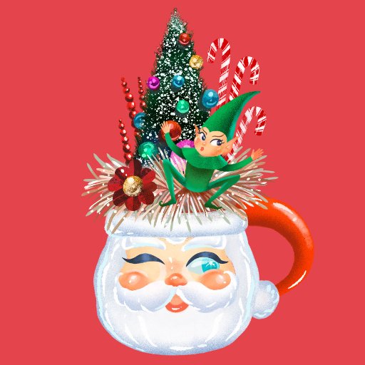 A jolly vintage Santa mug is filled with festive delight. Inside the retro beverage holder sits antique holiday decor including a dazzling Christmas tree, candy canes, and a green mischievous elf. Original illustration by Noël Snow