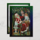 Richly-detailed restored Victorian Christmas greeting card art featuring red-robed Father Christmas giving toys to two little girls. Art is embellished with holly and mistletoe and gold highlights. Custom coordinating dark blue/green artisan background. Back features complementary graphics with editable text fields for your greetings.