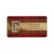 Unique, richly textured, elegant and ornate vintage style design featuring Victorian-era Santa image in an ecru lace frame decorated with red ribbon, gold flourish, sparkling beaded swirls, and poinsettias on a red subtly textured damask background. Centre band of antique parchment trimmed in glittering gold lace in a holly pattern with "Believe" text in sparkling gold.