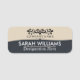 Add a touch of timeless elegance to your professional attire with this sophisticated name tag. Featuring a classic tan background contrasted with a deep navy blue lower section, this design is perfect for any business setting. The top of the tag is adorned with delicate, black scrollwork, adding a vintage flair, while the bottom clearly displays your name and designation. This tag is ideal for conferences, corporate events, or everyday office wear, ensuring you make a memorable impression with grace and style.