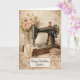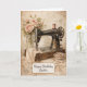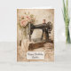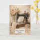 An antique sewing machine surrounded by soft roses, buttons, and vintage paper elements. Warm neutral tones and delicate floral details create a nostalgic sewing and craft themed composition.