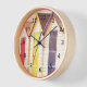 A vintage style, shabby chic photo of colourful blue, yellow, green and white traditional English wooden beach huts decorate this wall clock. The clock is numbered and has a red border.