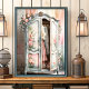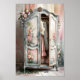 A vintage shabby chic wardrobe painted in soft pastels, with watercolor strokes highlighting its weathered wooden texture. The wardrobe features delicate floral patterns in light pinks, peaches, and lavender, with greenery subtly peeking through. Its doors are slightly ajar, revealing a peek of lace and vintage clothing inside. The background has a soft, faded look with hints of faded wallpaper or floral drapery, creating a dreamy, romantic atmosphere.