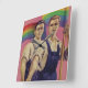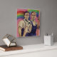 Vintage Soviet War propaganda style poster inspired design featuring an Asian and a blonde Russian man waving a rainbow pride flag with their hands touching. The men in the image are wearing overalls standing against a pink background.