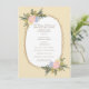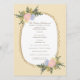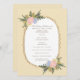 Elegant wedding invitation illustrated with a whimsical oval frame and watercolor flowers in peach pink, delicate yellow and sweet blue. Dark green leaves and twigs, together with a couple's silhouette inspired by vintage cameos are married with fancy script font. This design can be easily customised and the background can be changed to match the colour of your preference.