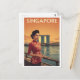 Experience the modern charm and cultural elegance of Singapore with this stunning vintage travel poster style postcard. The design features a graceful woman wearing a red and white floral qipao (cheongsam), standing against a backdrop of the iconic Marina Bay Sands hotel and the city skyline at sunset. The warm, golden and orange tones give the scene a romantic, retro glow. Perfect for sending a stylish greeting from the Lion City, decorating with Asian-inspired or mid-century modern art, or collecting travel memorabilia.