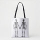 Vintage darkly humourous black and white image of a skeleton couple, one facing front, the other facing back, seemingly holding hands and looking into each other's eyes, as though they are about to begin a dance. Each anatomically correct skeleton is diagrammed with numbered bones, at one time possibly used in a science laboratory of old, or a classroom receiving a lesson in the human skeletal system. Here are the creepy lovers on an all-over print tote bag.